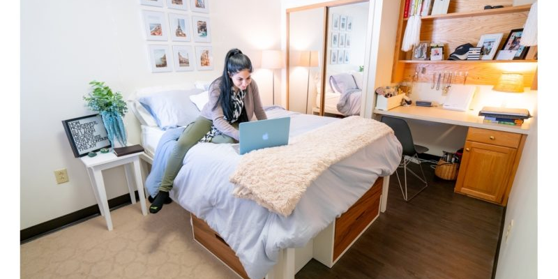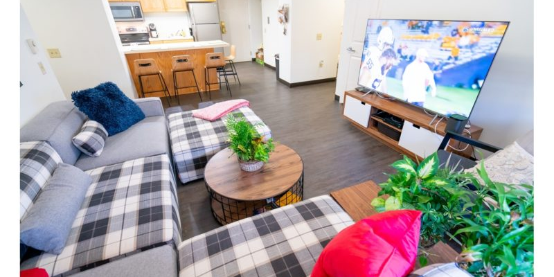 The popular Centre Court apartments are located just one half block from campus and feature four bedroom apartments with two bathrooms and deluxe furnishings. Each resident has their own private bedroom complete with a full-size bed, built-in desk, and individual climate control. Additional amenities include a keyed entry, covered parking spaces, on-site coin-operated laundry, and access to a new, fully-equipped fitness center. All utilities are included in the rent.