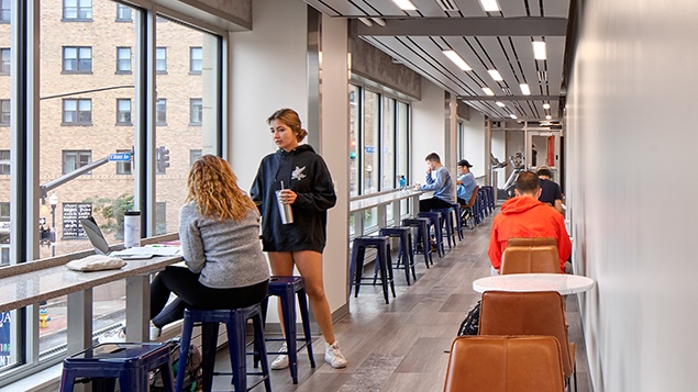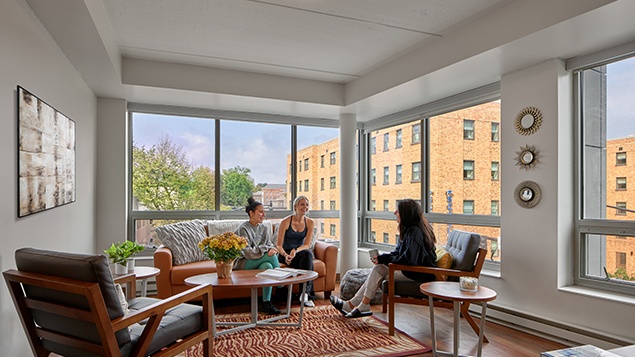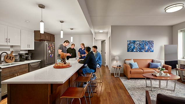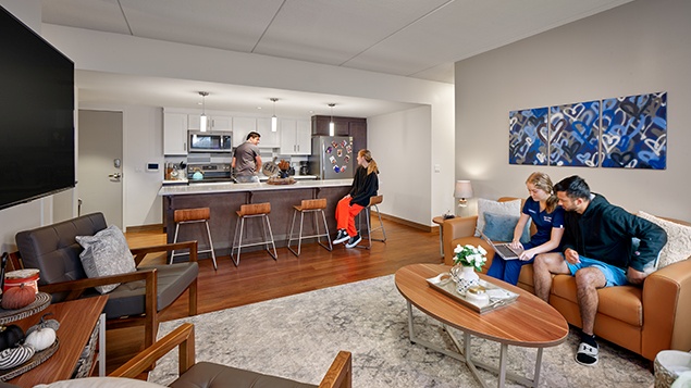 This mixed-use contemporary building features luxurious fully-furnished apartments with four bedrooms and three bathrooms, all within one block of the center of PSU campus.  Amenities include pre-installed flat-panel televisions, covered parking, and on-site pay-per-use laundry.  All utilities as well as TV and internet service are included in the rent! Apartments can fit four or five* residents.